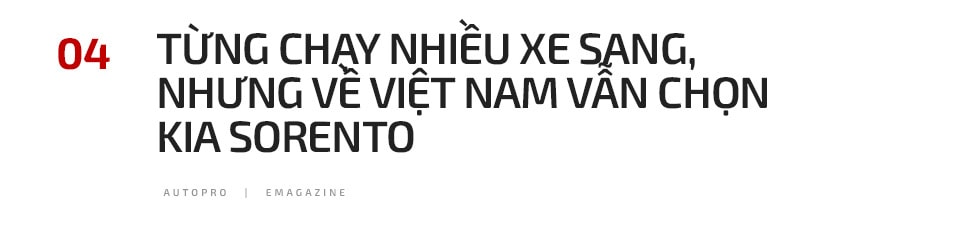 "Tôi khá thích Porsche. Lúc về nước, tôi định mua Porsche Macan, nhưng thứ nhất là chi phí bảo dưỡng hơi cao, và thứ hai là đang trong giai đoạn dịch nên muốn tìm một chiếc xe hợp lý hơn nên quyết định chọn Kia Sorento 2021. Hiện công ty tôi có chiếc Mercedes-Benz GLC 200, vì đó là xe chung nên sử dụng phục vụ việc riêng rất bất tiện và quyết định mua xe để phục vụ bản thân, gia đình".