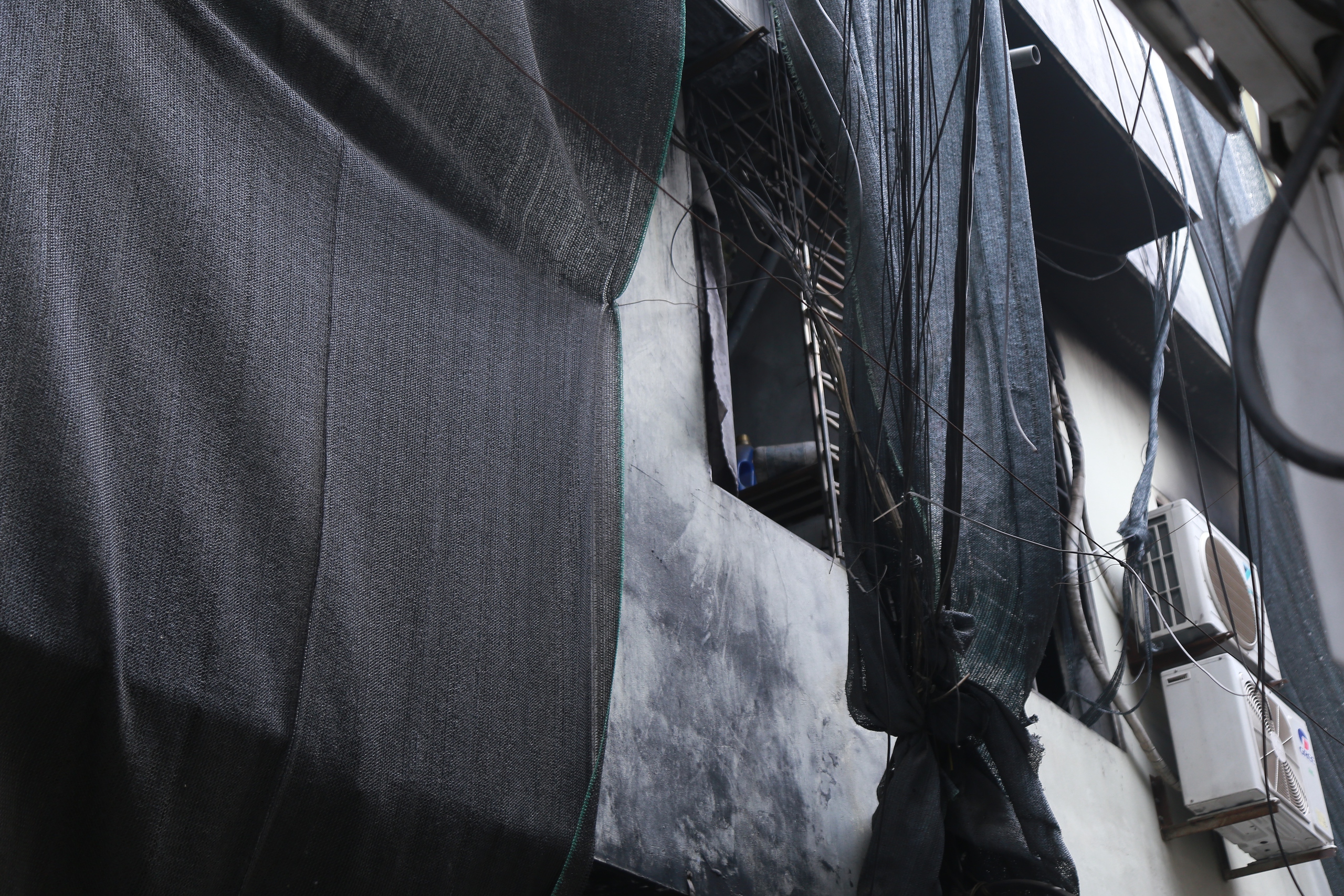 Từ tầng 2 trở lên cũng được phủ bằng bạt lưới đen.