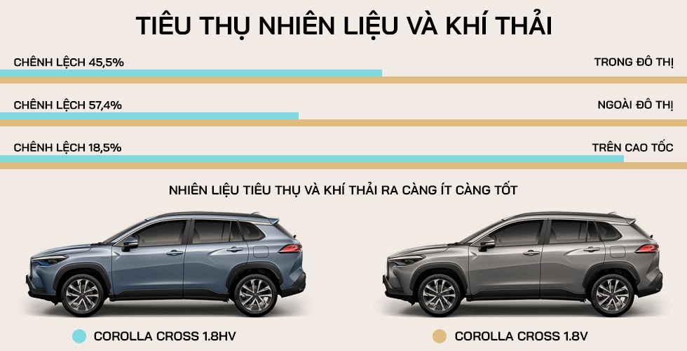 Ngoài khả năng vận hành vượt trội, xe Hybrid còn có nhiều ưu điểm khác, trong đó có khả năng tiết kiệm nhiên liệu và giảm khí thải ra môi trường. Cũng theo bài thử nghiệm của PGS. TS. Đàm Hoàng Phúc tại một số tỉnh thành phía Bắc, phiên bản Corolla Cross 1.8HV có lượng CO2 thải ra môi trường thấp hơn 45,5%, 57,4% và 18,5% so với bản 1.8V lần lượt trong điều kiện vận hành trong đô thị, ngoài đô thị và trên cao tốc. Các loại khí khác như CO, NOx và HC… thải ra từ bản Hybrid cũng thấp hơn.