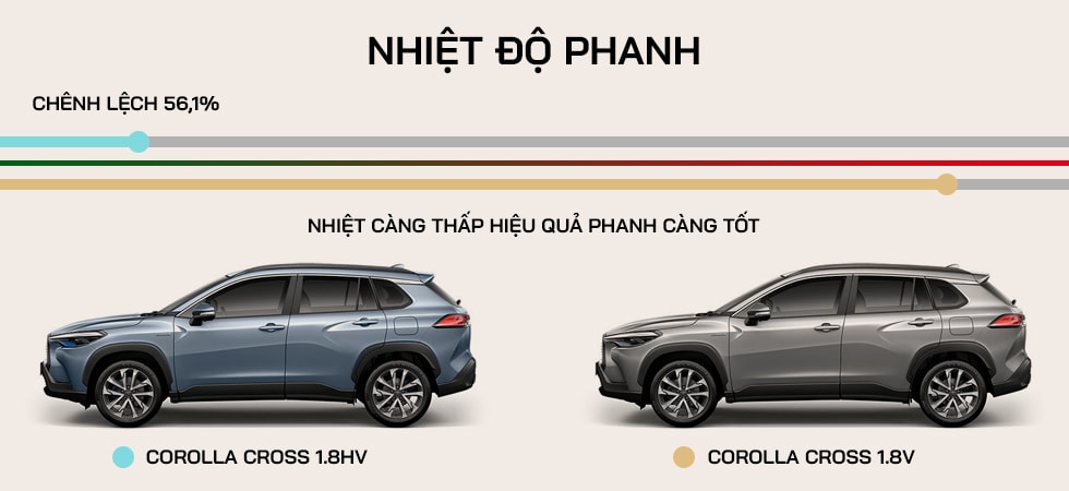 Vị Giảng viên Bách Khoa đã thực hiện ba bài thử. Ở bài tăng tốc, bản Hybrid nhanh hơn 0,65 giây so với bản xăng ở dải tốc độ 0-60 km/h, tức là có gia tốc tốt hơn ở dải vận tốc phù hợp khi di chuyển trong nội đô. Đối với phanh, bản Hybrid có quãng đường phanh giảm 17,82% và thời gian phanh giảm 35,82%. Thử nghiệm trên đường đèo, nhiệt độ má phanh bản 1.8HV thấp hơn 56,1% so với bản 1.8V. Điều đó có nghĩa là bản Hybrid an toàn hơn khi xét về khả năng phanh.